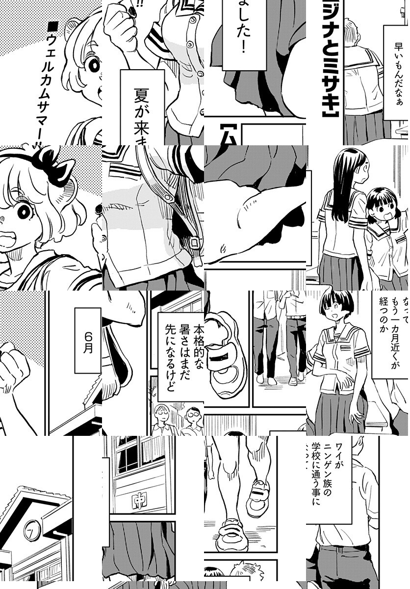 文明社会に憧れてニンゲン族の中学校に転校してきたムジナ族のハナ。 隣の席の百合川ミサキと早速友達になれたと思いきや、彼女は幽霊で!? 出会いと別れと恋と事件、全部が押し寄せる春が来た! 仲邑エンジツが贈る異種族入り混じるカオスな青春譚!