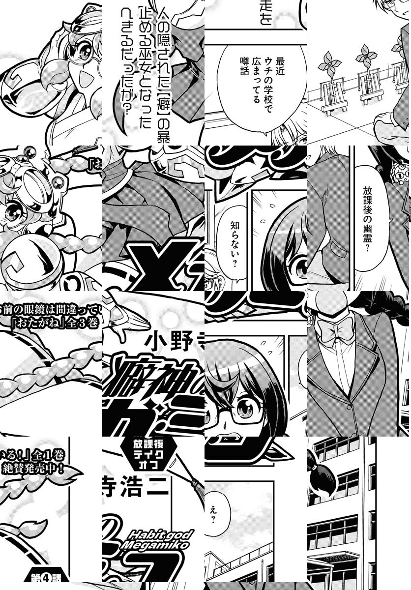 南雲へきるはドのつくメガネフェチ。そんな癖を嗜む癖人のへきるは、眼鏡神・遮光器姫ことシャコちゃんの力で眼鏡巫女(メガミコ)となり、暴走した癖神を浄化する!!フェチを愛する紳士淑女の皆様へ贈るフェティッシュコメディ!!