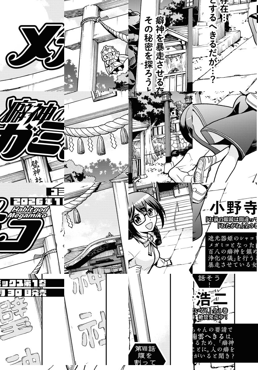 南雲へきるはドのつくメガネフェチ。そんな癖を嗜む癖人のへきるは、眼鏡神・遮光器姫ことシャコちゃんの力で眼鏡巫女(メガミコ)となり、暴走した癖神を浄化する!!フェチを愛する紳士淑女の皆様へ贈るフェティッシュコメディ!!