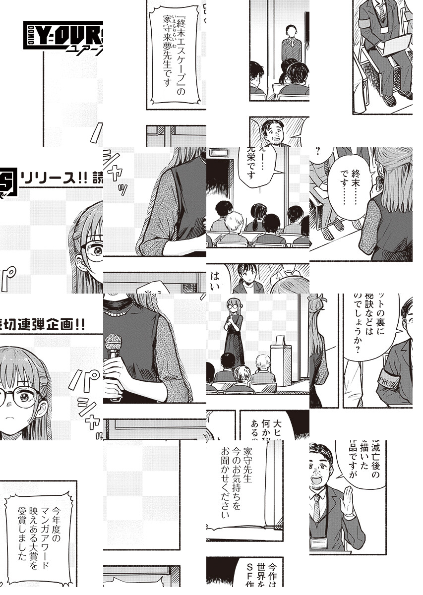 【『COMIC Y-OURS』リリース記念!読み切り11連弾企画!】過去の栄光はいずこ…ポストアポカリプスの世界を描き一世を風靡した漫画家・家守来夢は、現在終末論に取り憑かれ引きこもり生活を送っていた。そんなアパートの賃貸収入で食いつなぐ来夢のもとに、新しい入居者が現れて…?期待の俊英が描くひねくれ日常コメディー!